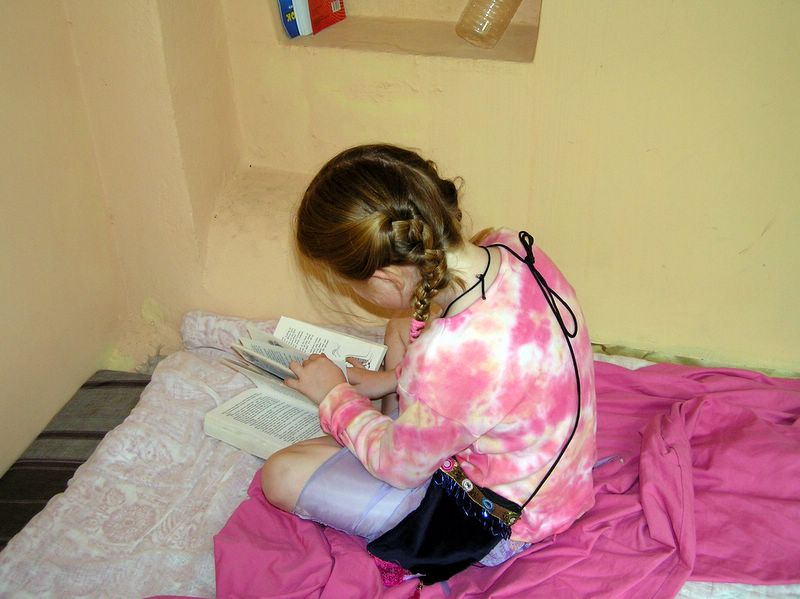 Kathmandu -- Jasmine in her room reading The Faraway Tree (Kathmandu Guest House)